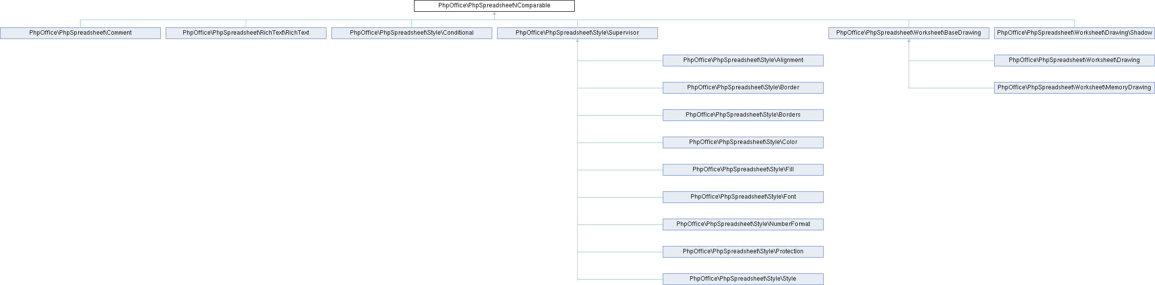 Implemented in PhpOffice\PhpSpreadsheet\Comment, PhpOffice\PhpSpreadsheet\RichText\RichText, PhpOffice\PhpSpreadsheet\Style\Alignment, PhpOffice\PhpSpreadsheet\Style\Border, PhpOffice\PhpSpreadsheet\Style\Borders, PhpOffice\PhpSpreadsheet\Style\Color, PhpOffice\PhpSpreadsheet\Style\Conditional, PhpOffice\PhpSpreadsheet\Style\Fill, PhpOffice\PhpSpreadsheet\Style\Font, PhpOffice\PhpSpreadsheet\Style\NumberFormat, PhpOffice\PhpSpreadsheet\Style\Protection, PhpOffice\PhpSpreadsheet\Style\Style, PhpOffice\PhpSpreadsheet\Worksheet\BaseDrawing, PhpOffice\PhpSpreadsheet\Worksheet\Drawing, PhpOffice\PhpSpreadsheet\Worksheet\Drawing\Shadow, and PhpOffice\PhpSpreadsheet\Worksheet\MemoryDrawing.