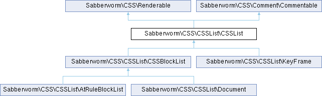 Implemented in Sabberworm\CSS\Comment\Comment, Sabberworm\CSS\CSSList\AtRuleBlockList, Sabberworm\CSS\CSSList\Document, Sabberworm\CSS\CSSList\KeyFrame, Sabberworm\CSS\Property\Charset, Sabberworm\CSS\Property\CSSNamespace, Sabberworm\CSS\Property\Import, Sabberworm\CSS\RuleSet\AtRuleSet, Sabberworm\CSS\RuleSet\DeclarationBlock, Sabberworm\CSS\Value\CalcRuleValueList, Sabberworm\CSS\Value\Color, Sabberworm\CSS\Value\CSSFunction, Sabberworm\CSS\Value\CSSString, Sabberworm\CSS\Value\LineName, Sabberworm\CSS\Value\Size, Sabberworm\CSS\Value\URL, and Sabberworm\CSS\Value\ValueList.